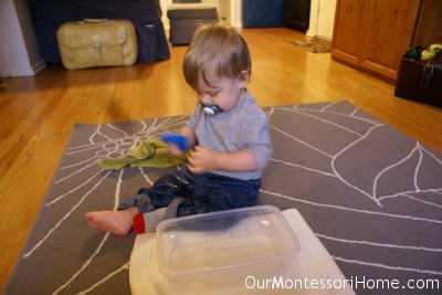 For Otto, I used a low, plastic container and a small sponge. The objective was for him to explore the water, soak water with the sponge, and then squeeze the water out of the sponge.